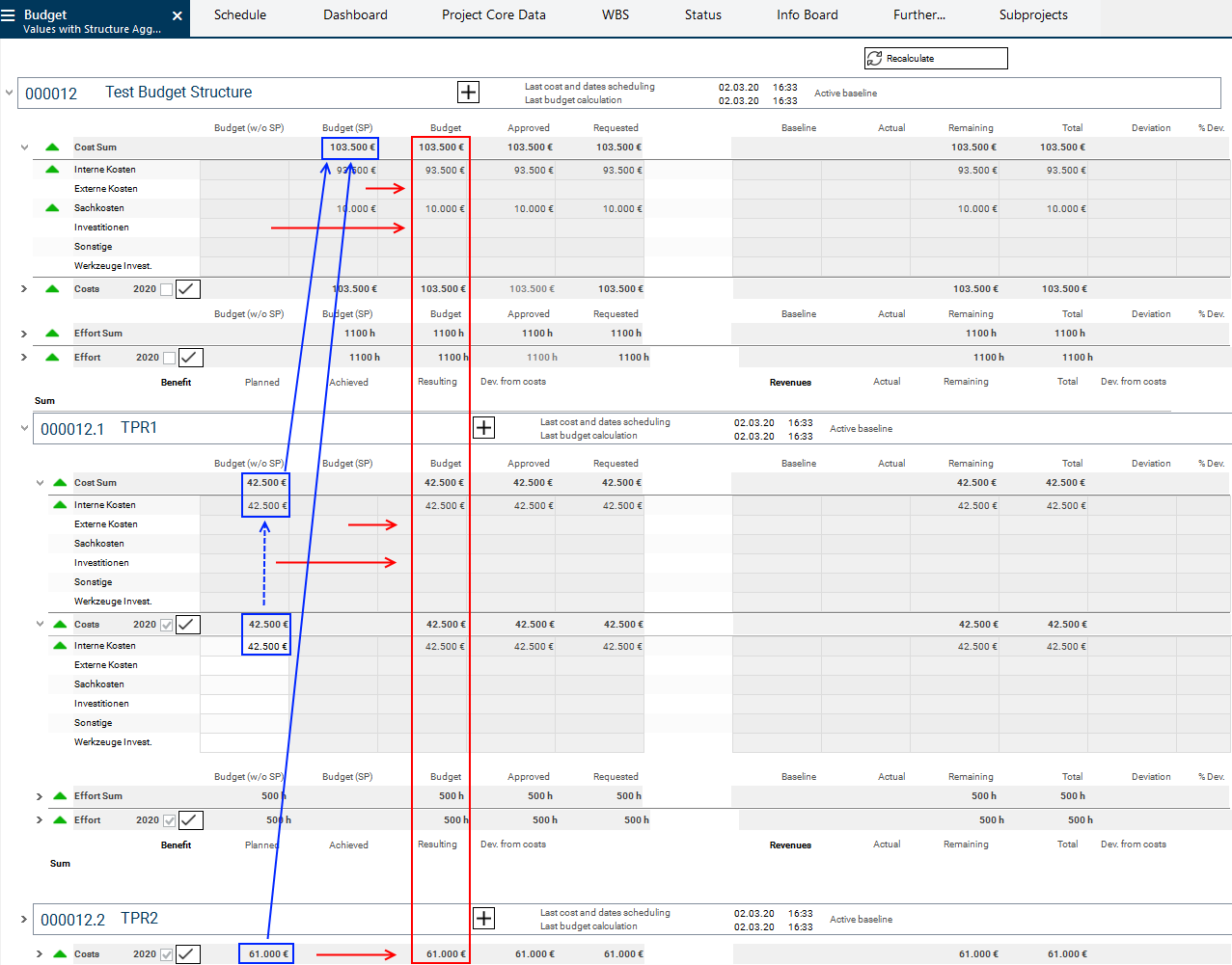 • As soon as the subprojects have been budgeted (the Budget (w/o SP) column in the subprojects has been filled) and the Recalculate button has been clicked on, the budget values will be summed up along the project structure.