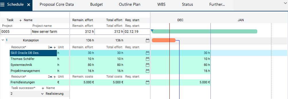 • If the effort has been allocated entirely from a skill resource to the employee resource, the project manager sees the employee resource which disposes of the required skill instead of the previously planned skill resource in the Schedule of the respective project.