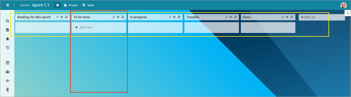 You can create an unlimited number of cards per board which allows for very detailed planning. For the sake of clarity, cards can be sorted by lists (vertically, marked red in the image) and swimlanes (horizontal, marked yellow in the image).