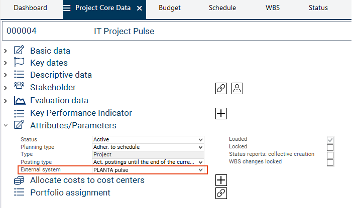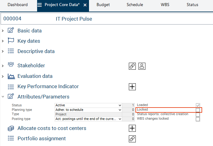 Deactivate the Locked checkbox in the Attributes/Parameters area in the Project Core Data module of IT Project Pulse.