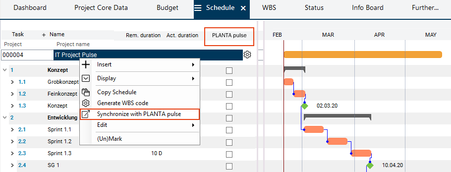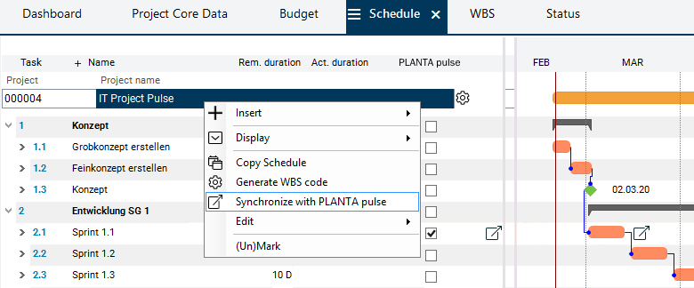 Right-click on the project header bar and select the Synchronize with PLANTA pulse command from the context menu.