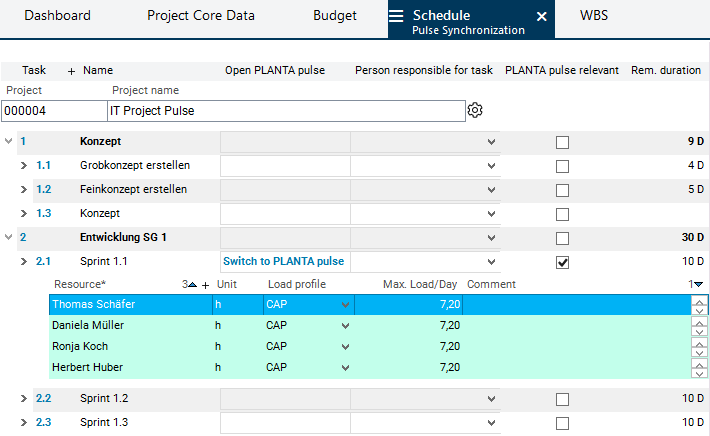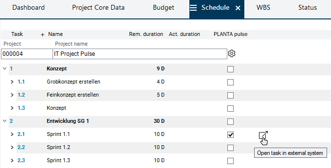 The outline planning in PLANTA project has been completed and the IT Project Pulse project is ready for synchronization. Georg Hart now wants to link and synchronize the Sprint 1.1 project task with PLANTA pulse, so that he can begin with his agile planning.