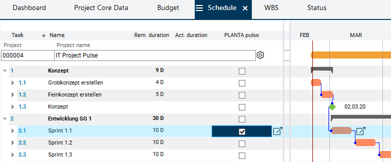 Activate the PLANTA pulse checkbox in the record of the Sprint 1.1 task in the Schedule module.