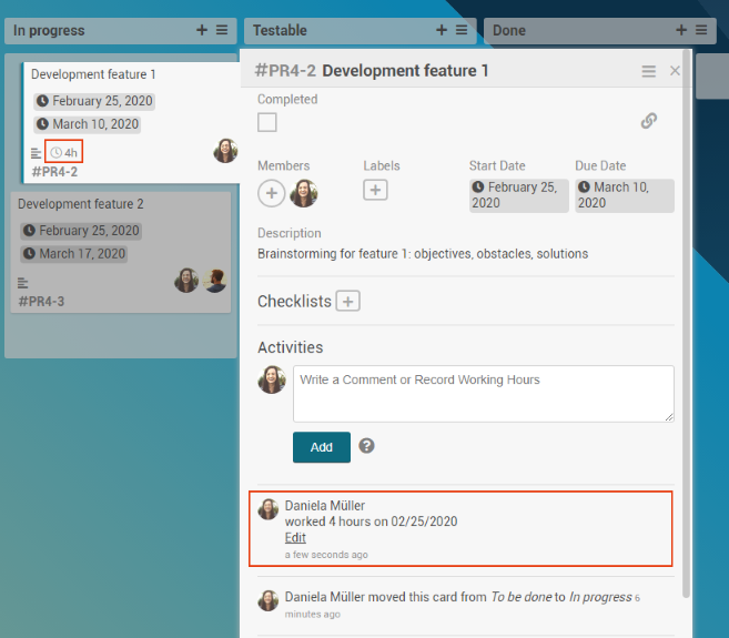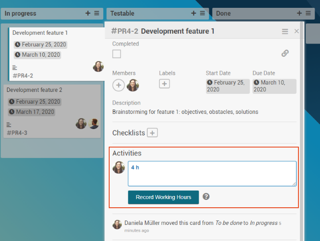 Result: Daniela Mueller can see her recorded hours on the thumbnail and in the activity history of the card.