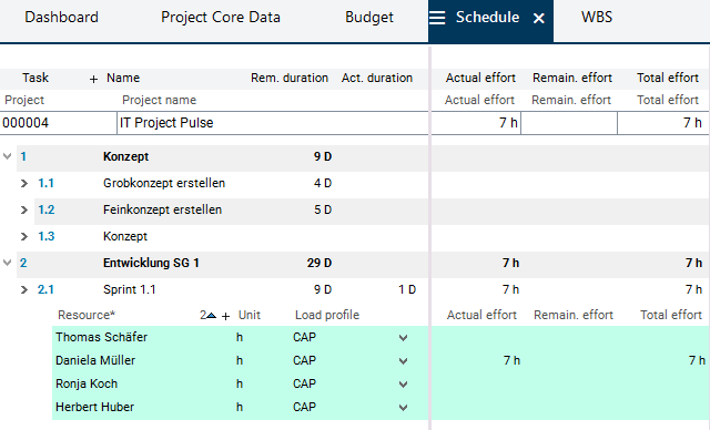 If hours worked are recorded in PLANTA pulse, the data is automatically synchronized with PLANTA project. There, load records are created in the respective project task for the corresponding resource assignments.