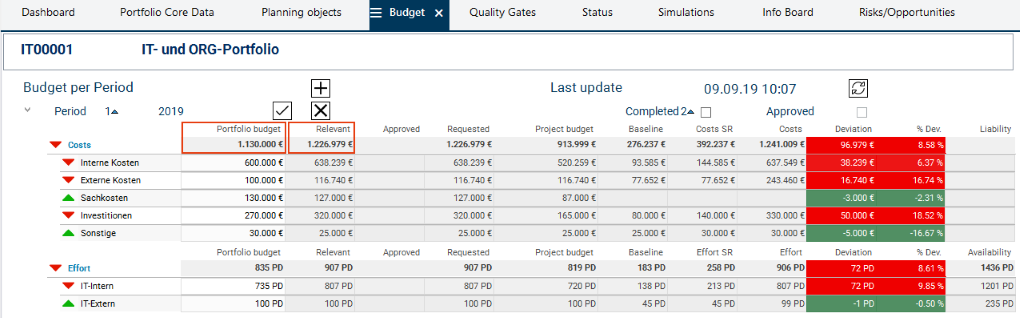 By the color display of the planning objects by code, the portfolio manager can immediately tell which planning objects cause the Overload. It is primarily the new proposal the code color of which is "orange".