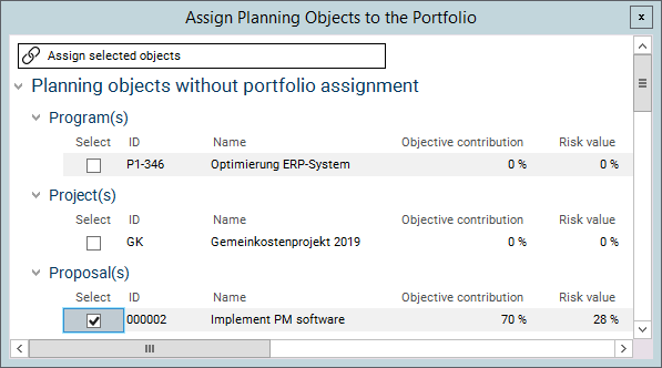In the Planning Objects module of the IT00001 IT- und ORG-Portfolio you can see that