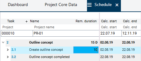 Enter the planned duration (e.g. 10 for 10 days) in the Remaining duration field in the Schedule module of the Create outline concept task.