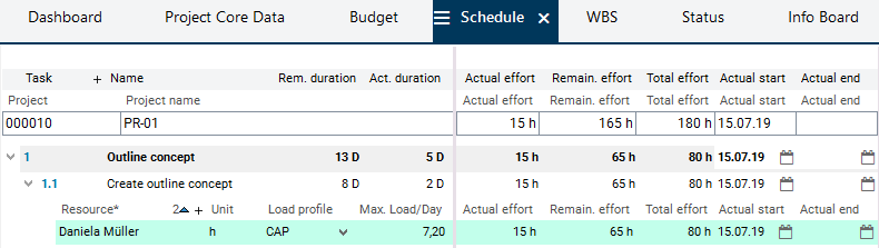 The schedule is refreshed: as a result, the reported hours are copied to the schedule as actual effort and the remaining effort is reduced accordingly. At the same time, the actual start of task and project is set to the date on which the first hours were reported and the duration of task and project is adjusted.
