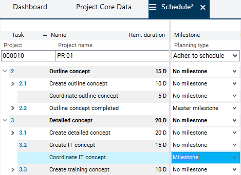 Link the new Coordinate IT concept milestone to the Create IT concept and Create training concept tasks in the same way and click on the Calculate schedule button in the toolbar.