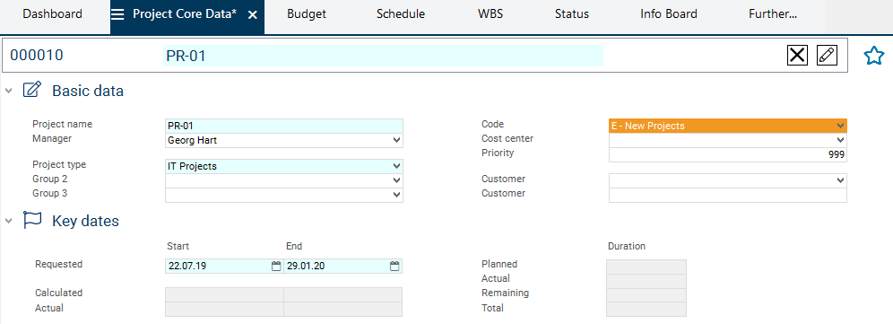 To do so, he selects Ronja Koch from the listbox in the Manager field in the Project Core Data.
