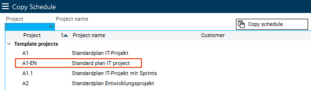 Select project template A1-EN Standard plan IT project from the listbox.