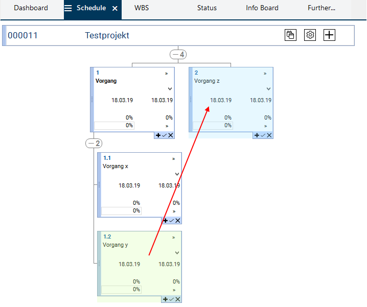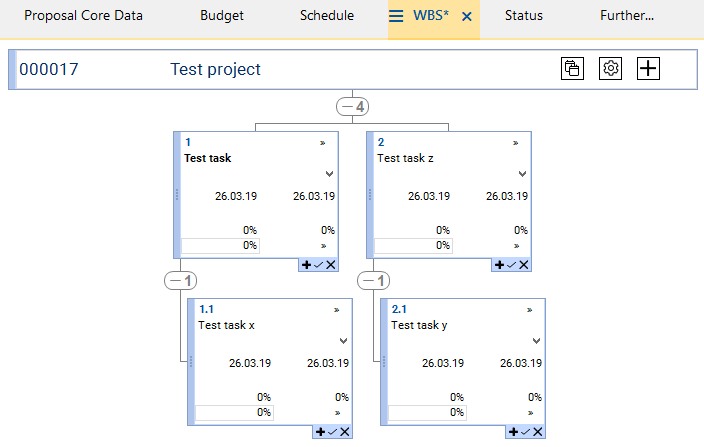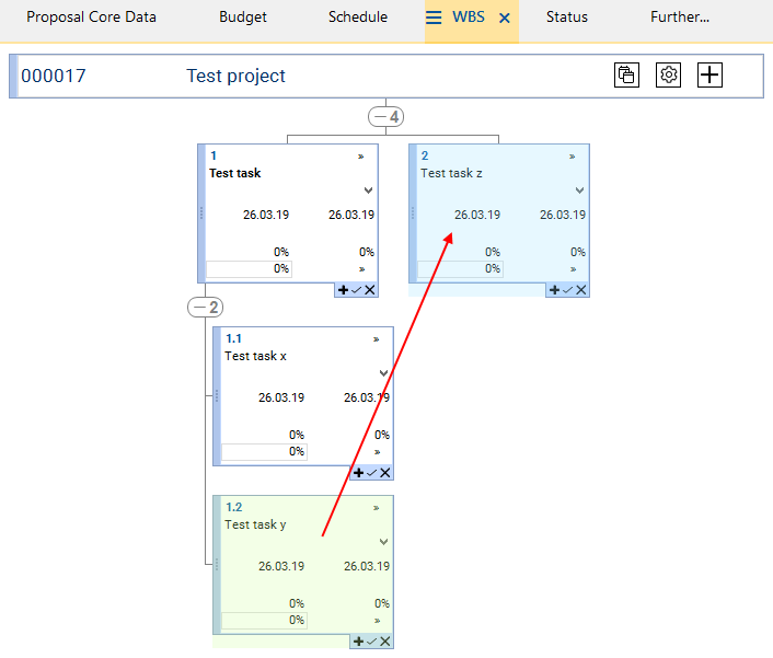 Result: Test task y is now subordinate to Test task z. However, the old WBS code is still displayed.