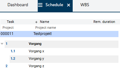 Result: The WBS code is assigned to the tasks and is displayed in the Task column. Since the tasks have not been structured yet, this is only done by ascending numbering.
