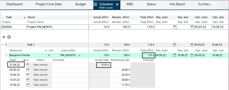 - Scheduling creates a load record with 100 h at the end of the task (on the last working day of the specified duration).