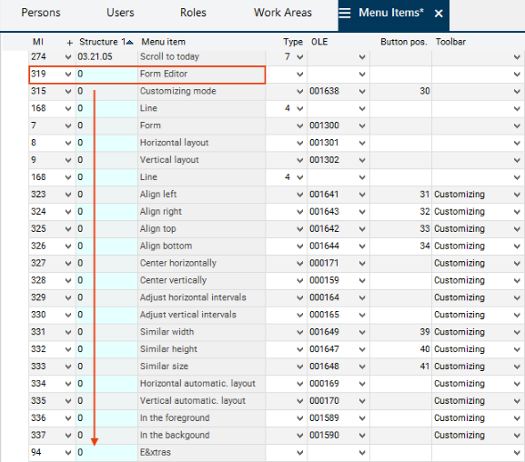Consequently, in the case of Ralf Schulze, enter 0 in the Structure field for all menu items starting from Structure number 04 (menu item 319 Form Editor).