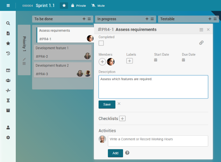 Georg Hart decides that feature 3 in the Sprint 1.1 project task has a low priority. In order to have this represented in the board, he moves the Development feature 3 card to the Priority 2 swimlane.