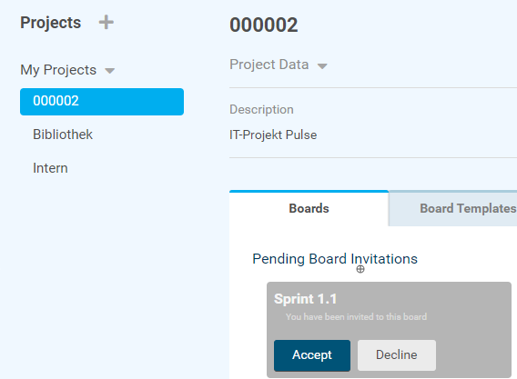 The next time Thomas Schaefer opens PLANTA pulse, he sees the board of Sprint 1.1 to which he was invited in the Boards tab of the IT Project Pulse project.