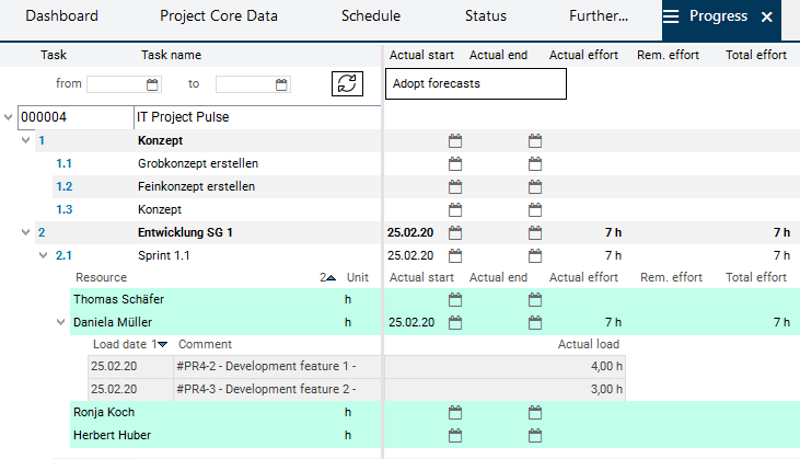 If hours worked are recorded in PLANTA pulse, the data is automatically synchronized with PLANTA project. Here, load records for the respective resource assignment are created in the respective project task.