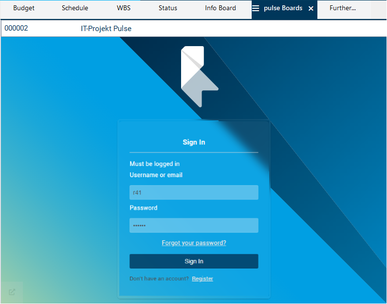 If synchronization was successful, the new pulse-Boards tab is displayed in the tab bar. It contains a widget with the PLANTA pulse view which allows you to edit PLANTA pulse data without having to switch to pulse. (If you want to switch to the pulse application regardless, you can do so by clicking on the change app symbol at the lower left margin of the widget.)