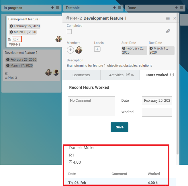 Board members can record hours worked directly on the corresponding cards.