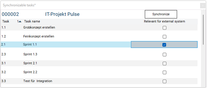 In the line of the Sprint 1.1 task, activate the Relevant for external system checkbox and click on the Snychronize button.