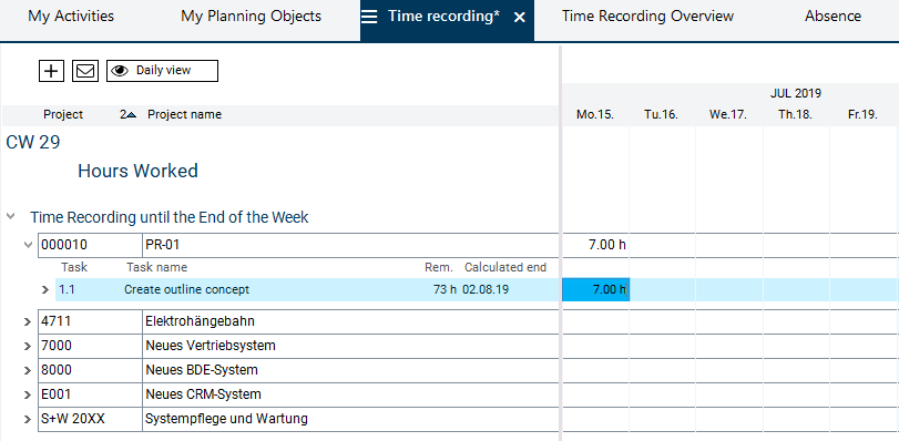 • As a result, the planned value displayed in the Remaining field is reduced automatically so that you can quickly see how many of the planned hours still remain for the completion of the work.