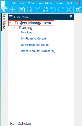 • Result: At Ralf Schulze’s next login, the My Planning Objects module will load automatically because it is the default startup module for the Project Management role. Caution: Since the new user does not have any planning objects, the module is empty at first.