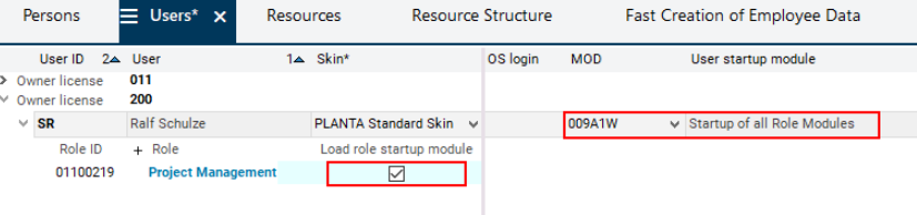 • When assigning the role, activate the Load startup modulecheckbox in the line of the Project Management role.