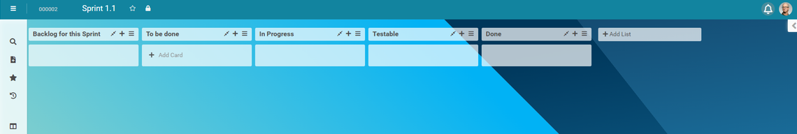 The Sprint 1.1 board contains defined lists by default due to a stored template: Backlog for this sprint, To be done, In progress, etc.