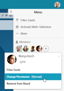 Open a menu by clicking on Ronja Koch’s avatar in the Members section and selecting the Change permissions entry.