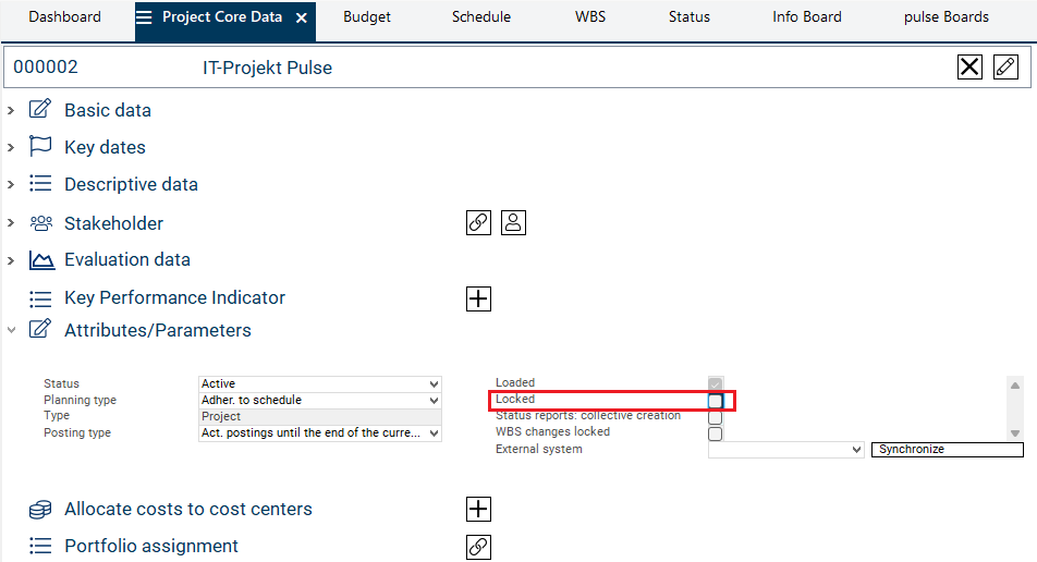 Deactivate the Locked checkbox in the Attributes/Parameters area in the Project Core Data module of IT Project Pulse.