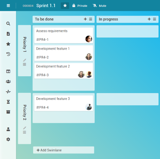 Georg Hart decides that feature 3 in the Sprint 1.1 project task has a low priority. In order to have this represented in the board, he moves the Development feature 3 card to the Priority 2 swimlane.