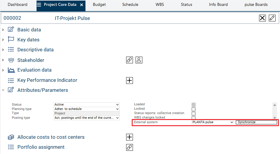 Select the PLANTA pulse entry from the External system listbox in the Project Core Data module in the Attributes/Parameters area.