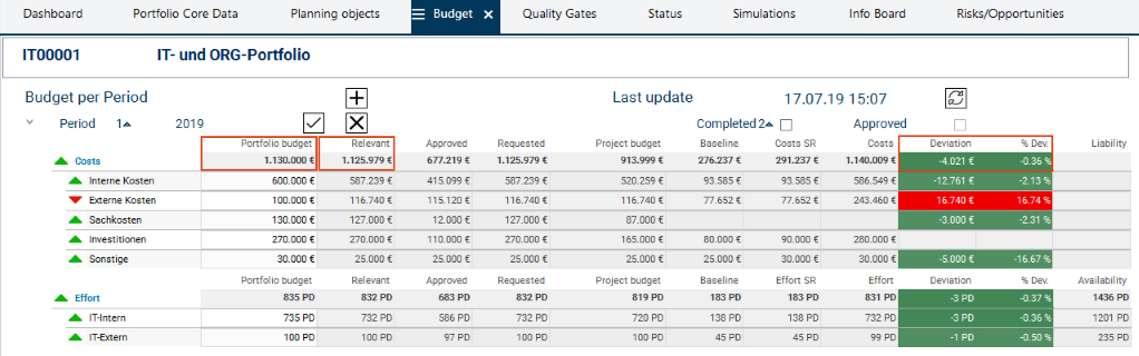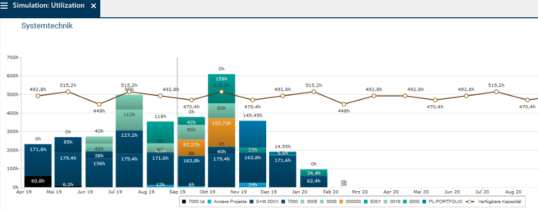 By the color display of the planning objects by code, the portfolio manager can immediately tell which planning objects cause the Overload. It is primarily the new proposal the code color of which is "orange".