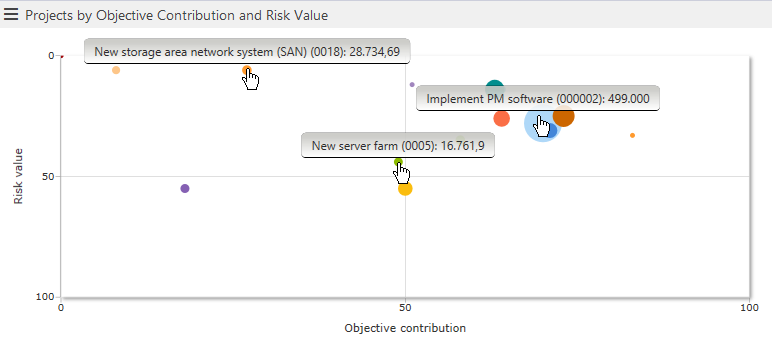 The visual comparison option helps the portfolio manager to quickly come to a decision on which ideas or proposals to cancel and which ones to turn into projects.