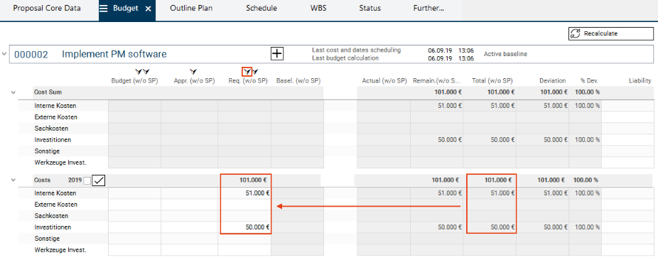 Wera Heine clicks on the Recalculate button. The figures from the Costs 2019 yearly tranche are summarized to project total level.