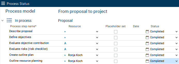 You can select a status from the listbox for each process step.