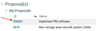 Wera Heine clicks on the link on the ID of the Implement PM software proposal to open the Proposal panel.