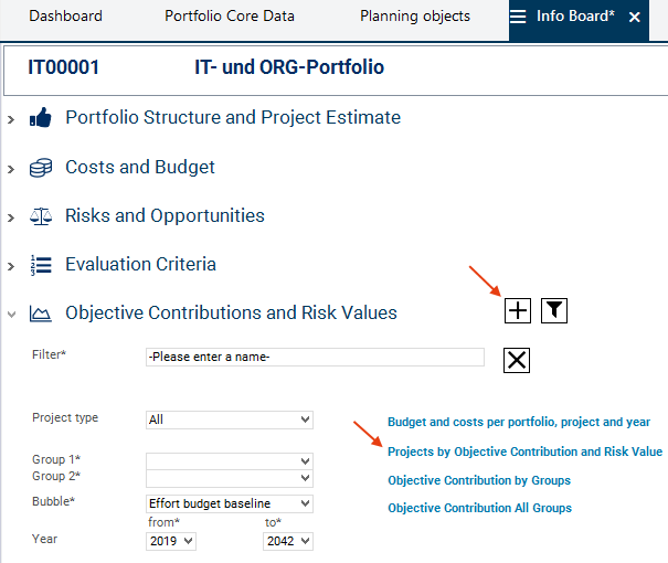 In the Objective contribution and risk values area she clicks on the Insert filter button and subsequently on the Projects by objective contribution and risk value link.