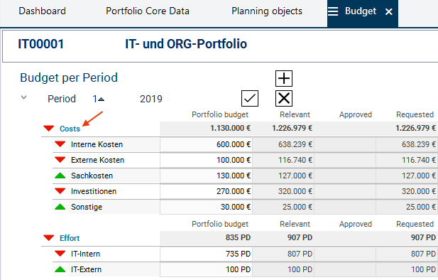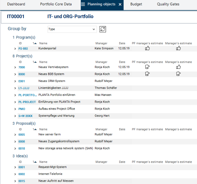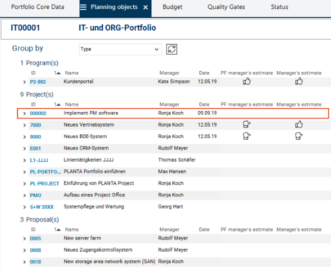 In the Planning Objects module of the IT00001 IT- und ORG-Portfolio you can see that