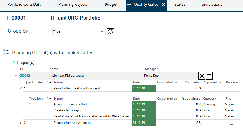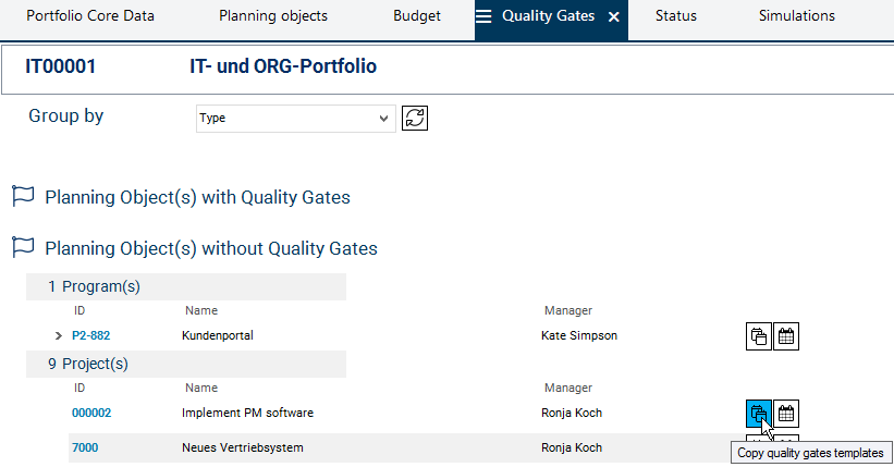 In the Quality Gate Templates module, templates are created which can be selected for individual portfolios and which then apply to all planning objects of these portfolios.