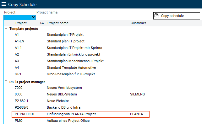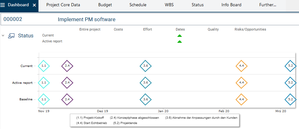 The portfolio manager wants to adjust the quality gate dates set in the template by default to those of the project. For this purpose, she wants to check the schedule of the Implement PM software project.
