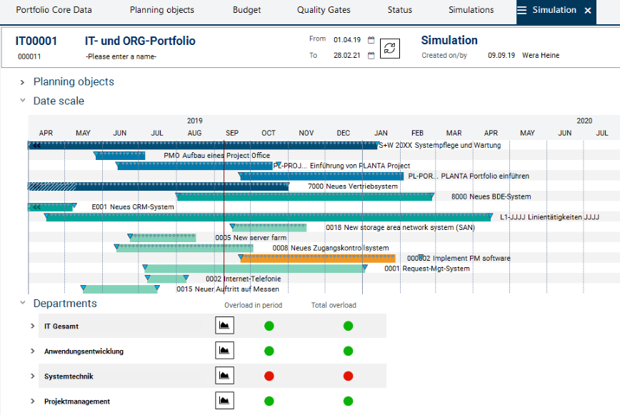 After the portfolio manager has moved the dates (if necessary, also the dates of another planning object), the traffic light switches from red to green, indicating that the overload of the Systemtechnik department has disappeared.