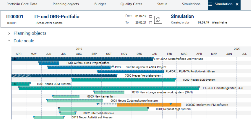 Graphical display of the dates of all portfolio planning objects in the Simulation module.