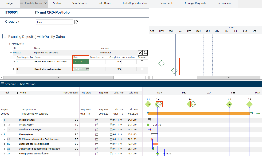 According to the calculated dates of the project, the portfolio manager sets the dates for the quality gates in the Date field and carries out the schedule calculation in the Schedule module.