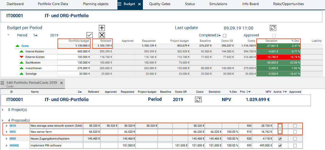 In the Proposal area, she deactivates the Active checkbox of proposals 0005 and 0018. As a result, the budget reserved for these proposals is no longer considered in the portfolio, i.e. the Relevant budget is reduced.