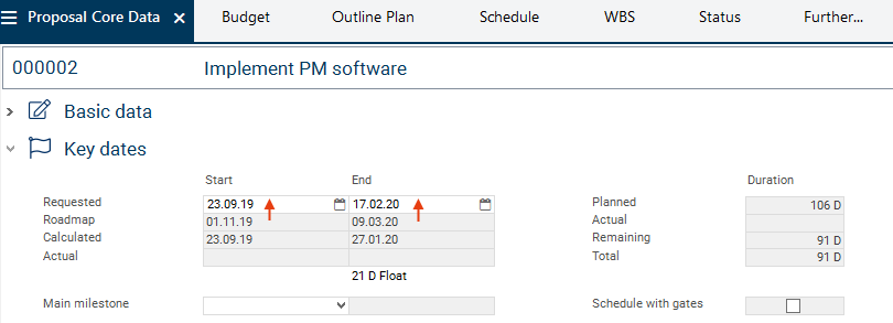 The road map dates are subsequently displayed in the Proposal Core Data and can be adopted as as new requested dates for the proposal by copying.