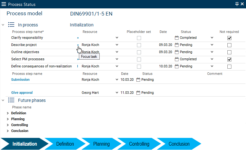 In the Process Status module, Ronja Koch sees that all project-specific process steps of the Initialization phase have the Completed status. Now she wants to submit the process steps of the Initialization phase. To do so, she needs to complete the Submission process step.