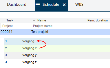 • Result: The WBS code is assigned to the tasks and is displayed in the Task column. Since the tasks have not been structured yet, this is only done by ascending numbering.